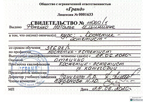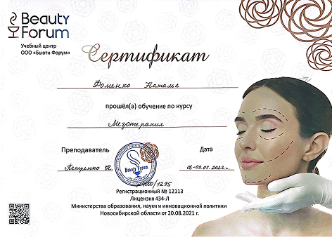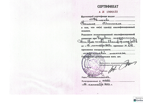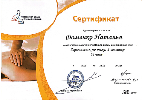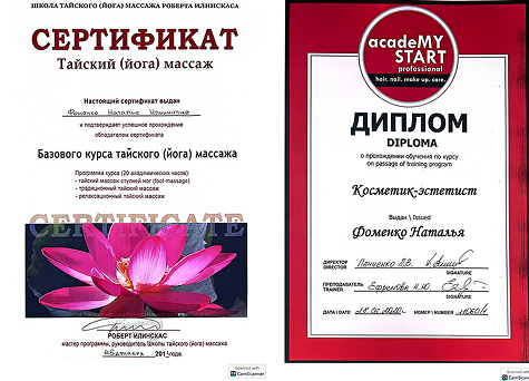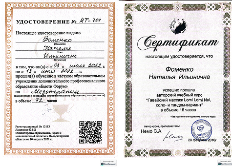 Специалист восточной оздоровительной гимнастики и массажа, специалист по тайскому Йога-массажу, Гавайскому и Хиромассажу, массажу лица Академии Скурихиной.
